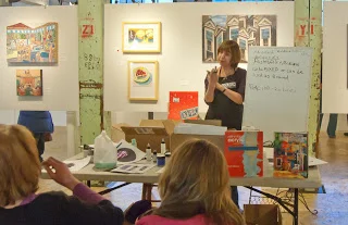 One of the driving forces in our desire to open a gallery at Fountain Street Studios was to have a place to congregate as artists- to learn from one another, to have a break from the necessary isolation in which we do our best work. Last week we had an opportunity to see that wish come true. Adria Arch, a working artist with Golden Paints, conducted a free workshop at the gallery. Adria spent a couple of hours demonstrating the unique properties of many of the newest Golden products. About twenty people attended, about half of them from the building. It felt really good to see the gallery as the resource we'd imagined, and to see it filled with artists learning from one another.