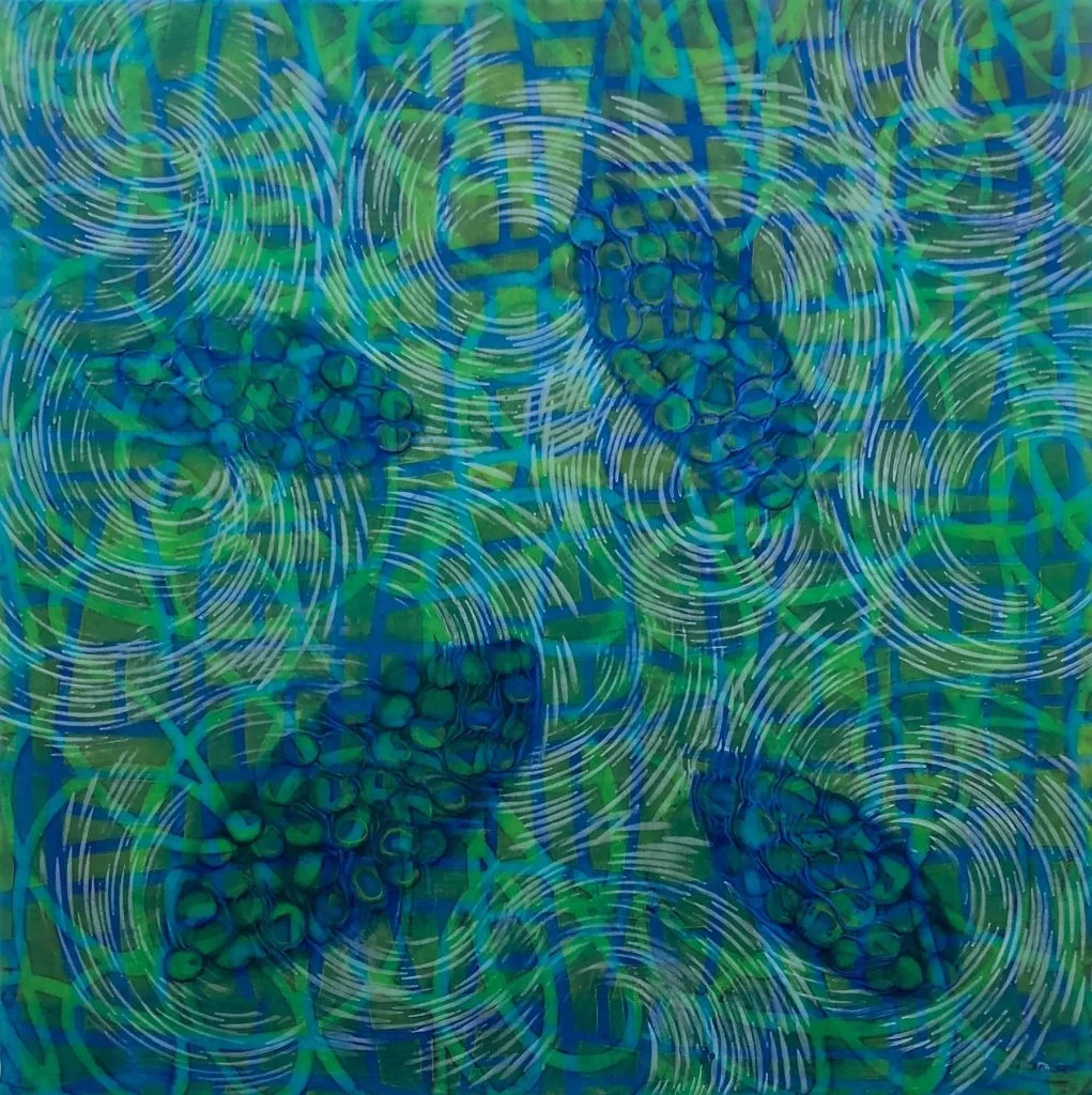 The process of painting with encaustic* builds layer upon layer of biomorphic forms, suggesting growth, development and movement. I construct environments for these forms, landscapes in which they can interact.