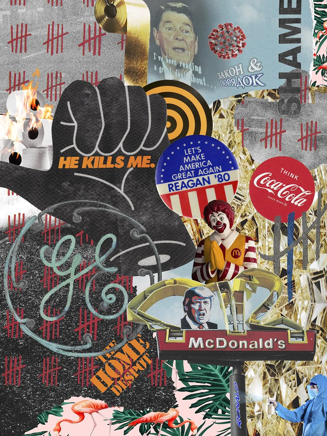 “#1 Family Attraction” features the collages of Robyn Day and Ileana Doble Hernandez. The show is a phenomenological response to this moment in U.S. history—the language of artists grappling with the enormity and complexity of sociopolitical tumult. Each artist turned to collaging the media to make sense of what seems incomprehensible in its pages: a global pandemic, totalitarian impulses in a U.S. political party and other parts of the world, the erosion of civil rights, and an incalculable backlash of racism, sexism, homophobia, and xenophobia. Day builds collages digitally, drawing historical parallels to earlier crises and pointing to the dangers and absurdities of extremism. Doble Hernandez browses through magazine pages in an attempt to get away from the screens, only to find reminders of the same news she’s trying to avoid. Cutting and placing clips together helps her deal with the irrationality of the situation. Both artists are engaged in making political posters as a way to process, heal, refocus and continue the fight.