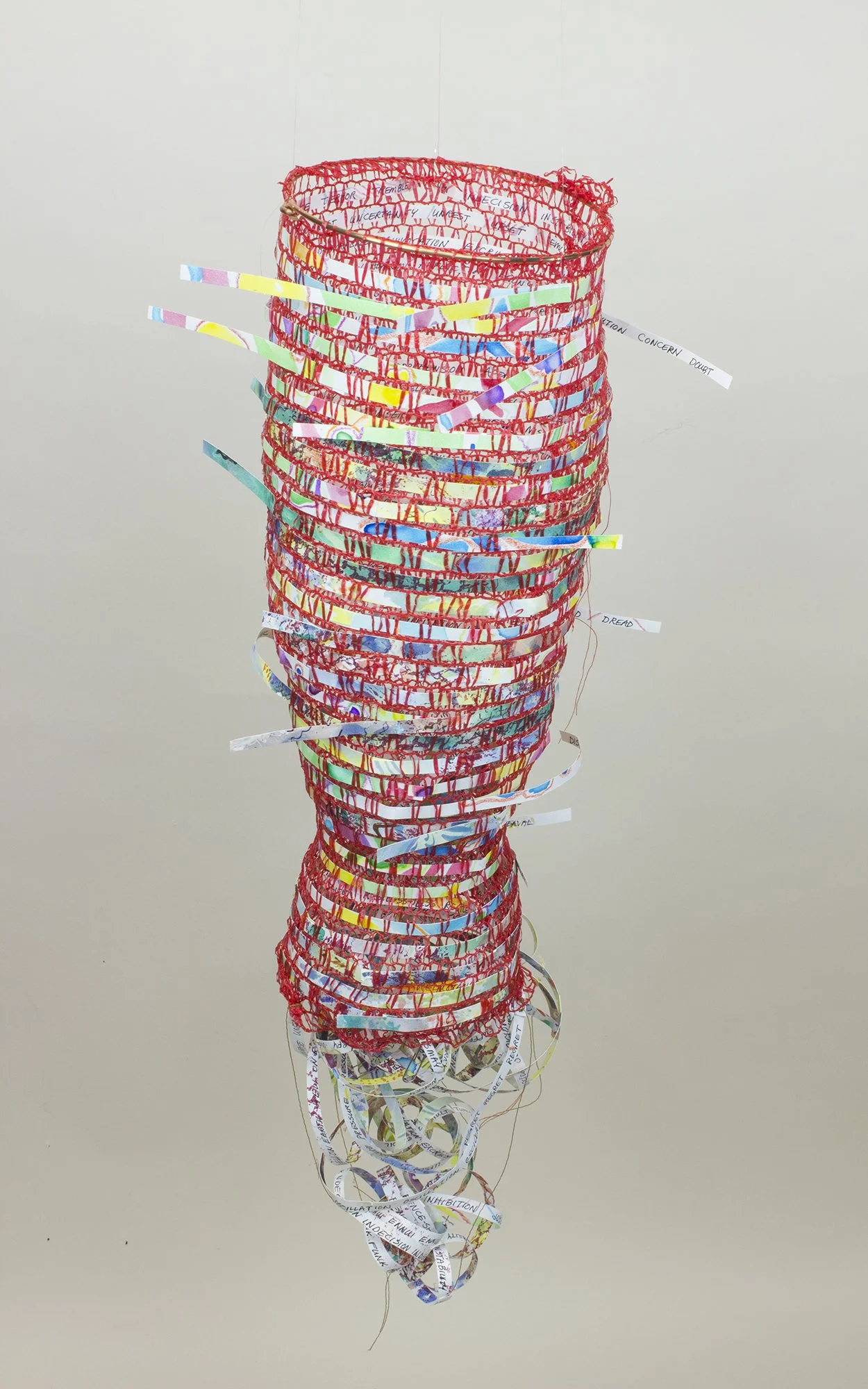 Virginia Mahoney, a Brockton-based mixed-media artist, displays a three-dimensional bright red sleeve suspended from the wall. Constructed of food net, watercolor, ink on paper, steel and thread, “Anxious” is emblematic of our times, in which uncertainty rules supreme. Curlicues of paper strips dangle below the red sleeve read: FRUSTRATION, TORMENT, REGRET, FIXATION, even HELL ON EARTH. Take a deep breath.