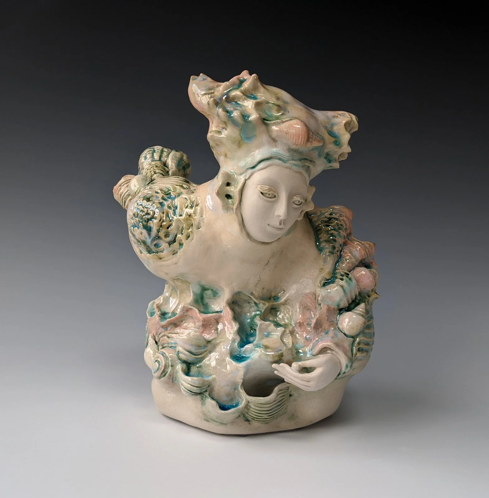 Natasha Dikareva was born in Kiev and lives in San Francisco, and she presents a small, pedestal-mounted feminine figure, delicately glazed with pale blues, soft greens and pinks. She wears a cloak of seashells and seems to exist somewhere in the realm of mythology, perhaps a nereid, a daughter of Nereus, the Old Man of the Sea. She appears as a being of two worlds, certainly a shared experience for many.