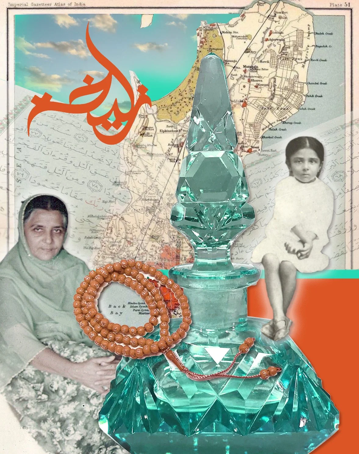 Nilou Moochhala, born in Mumbai and presently of Arlington, exhibits two 8” X 10” collages tucked away in a corner by the entrance to the gallery office. But don’t overlook them.