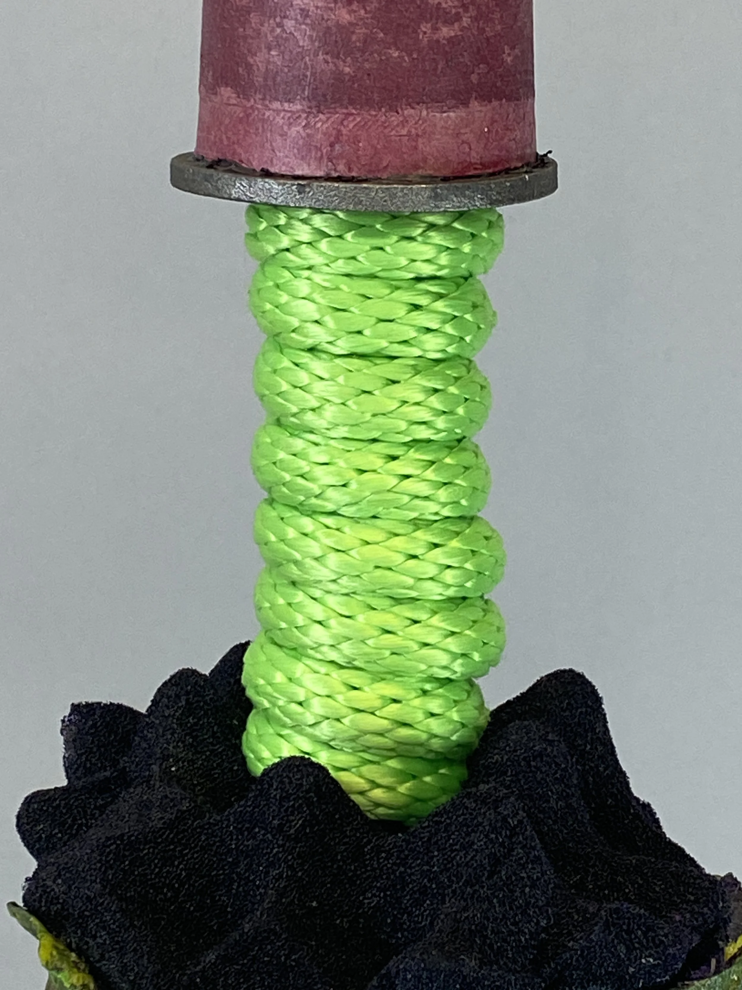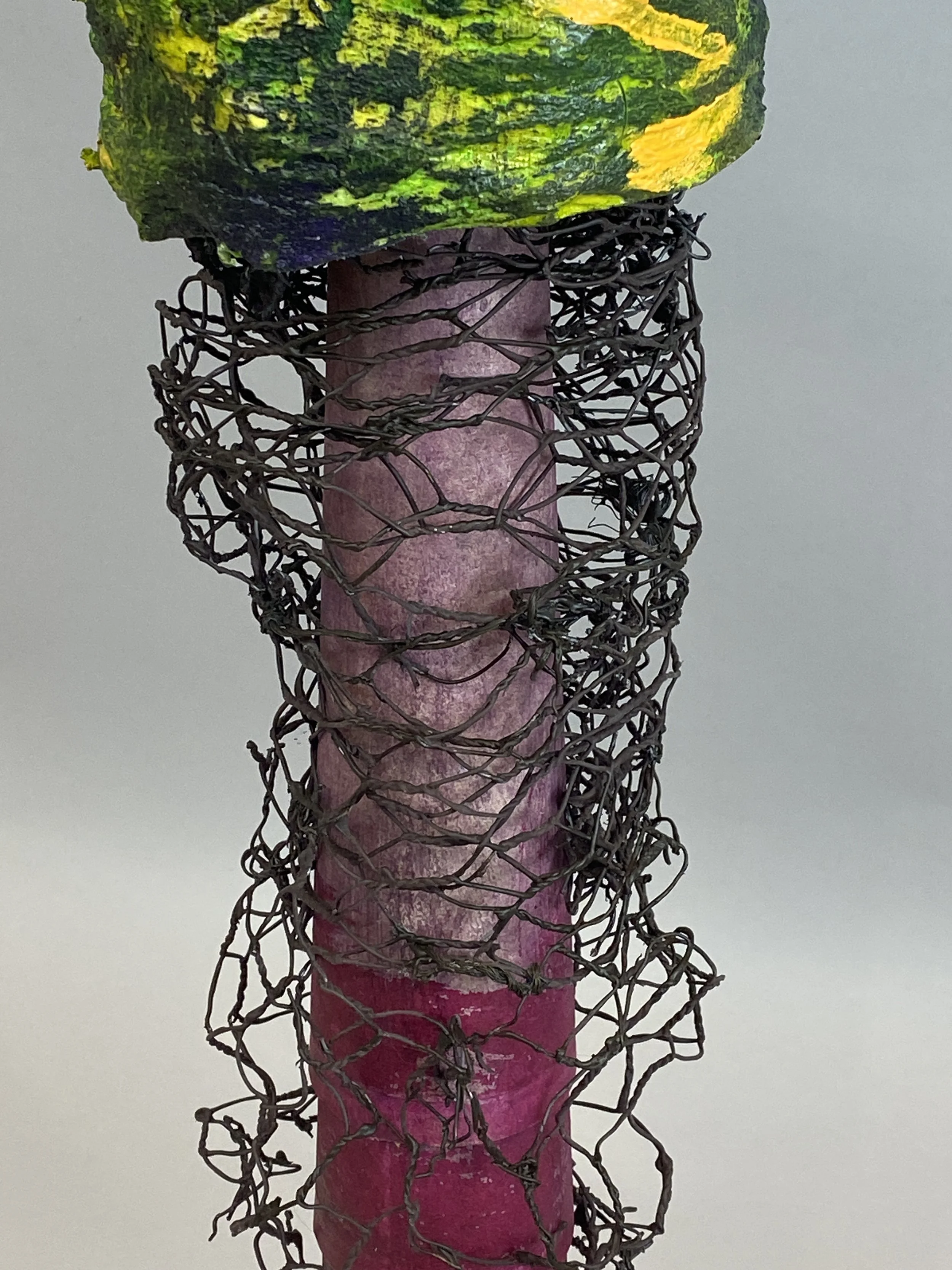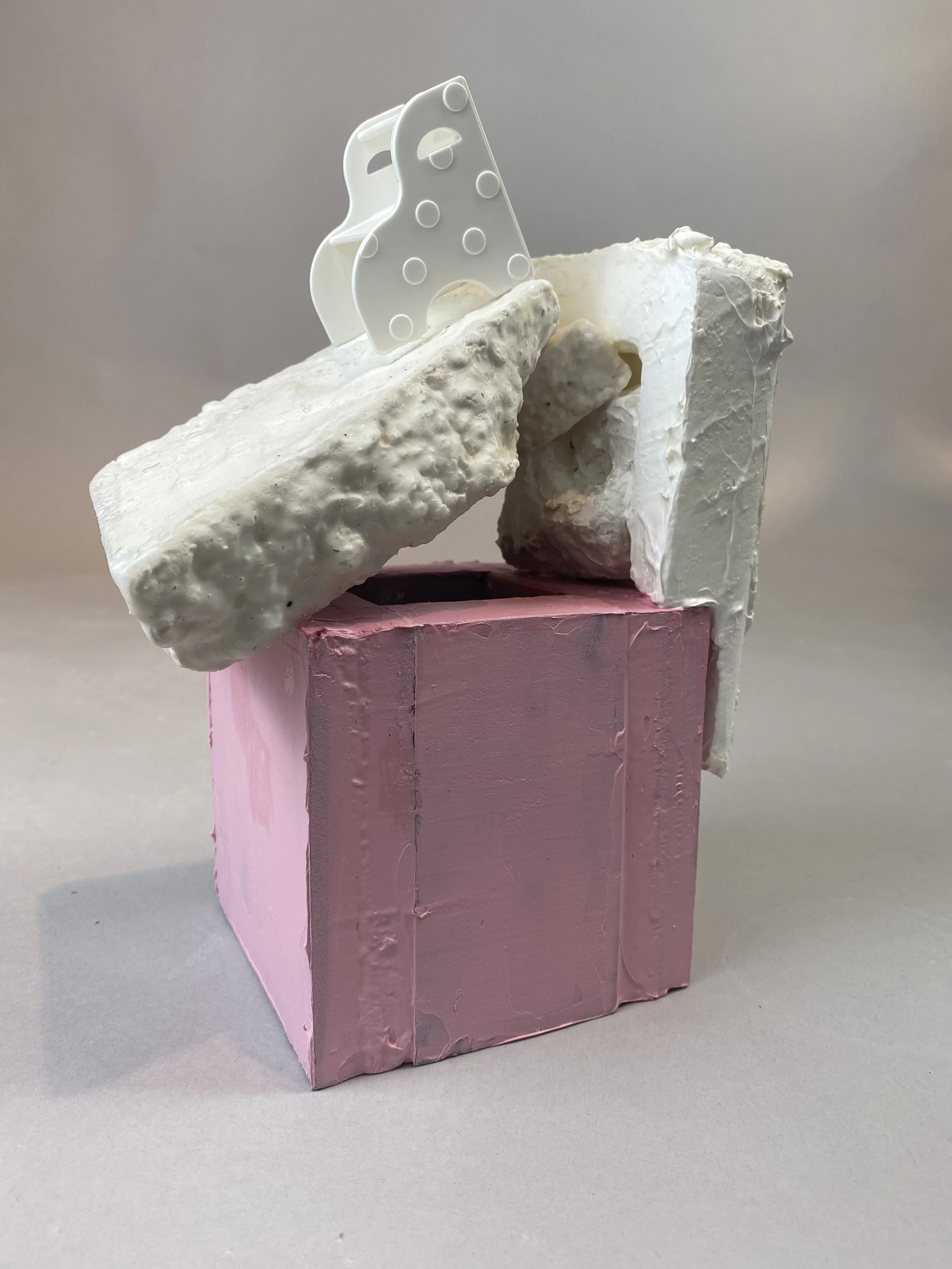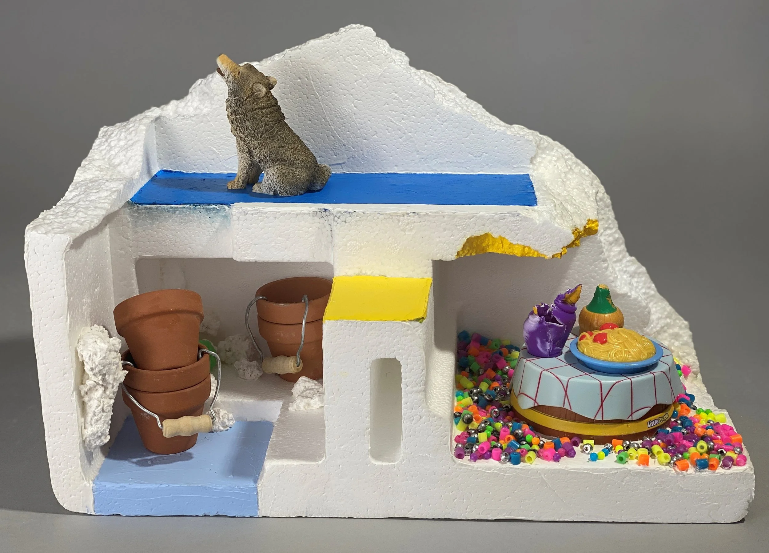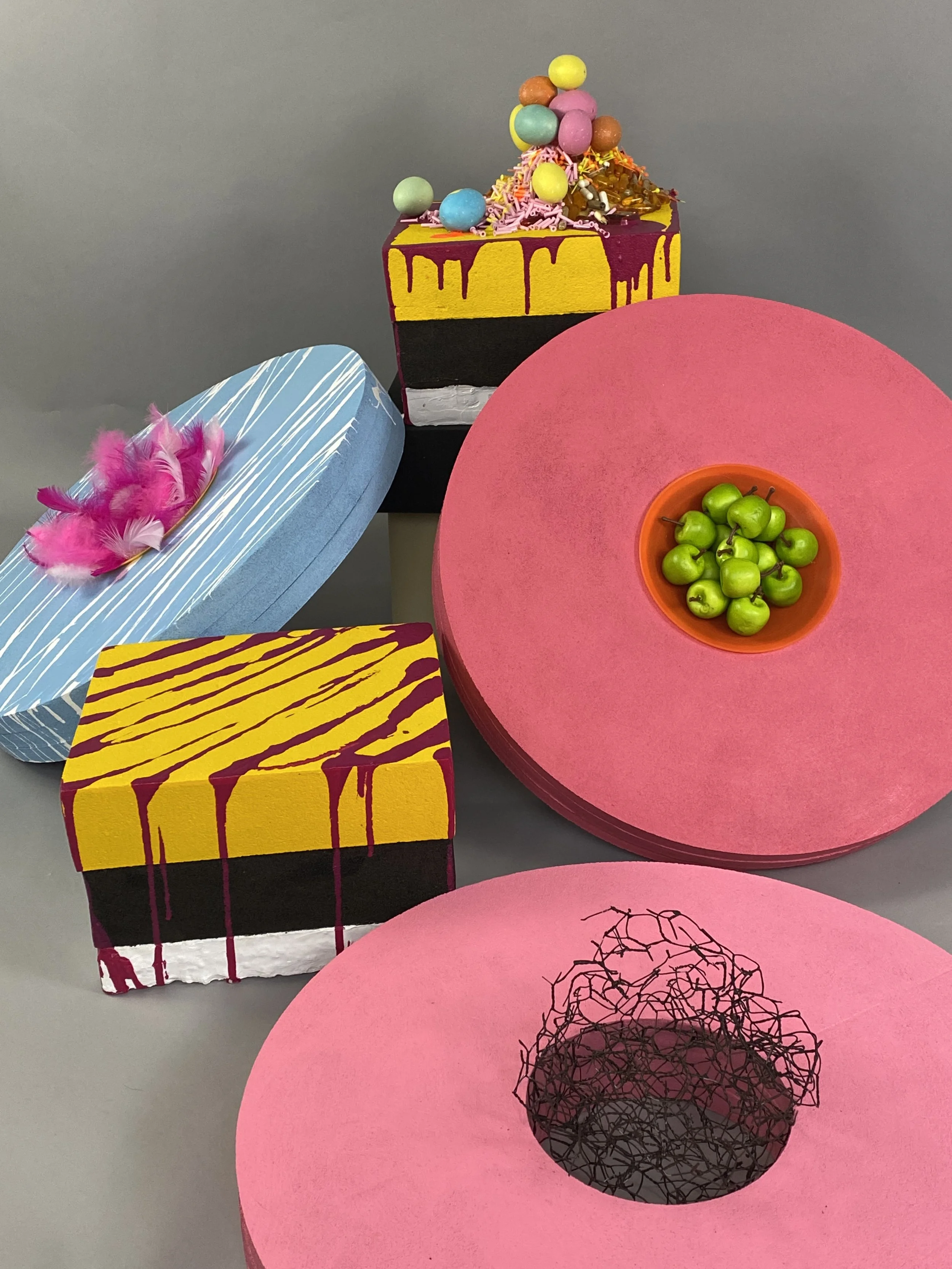 The work by Sylvia Vander Sluis focuses on the disorienting experience of caring for a loved one with Alzheimer’s and other chronic diseases during the pandemic. A mix of outsized confections and precarious towers reflects the profound dichotomy between life before and life after disease begins to take its toll. Eggs, toppling on the icing of a cake, mix incoherently with medical supplies. A tree house represents both the desire to play and the desire to escape. Quiet totems combine energetic color with more meditative forms that point to a hope for serenity.
