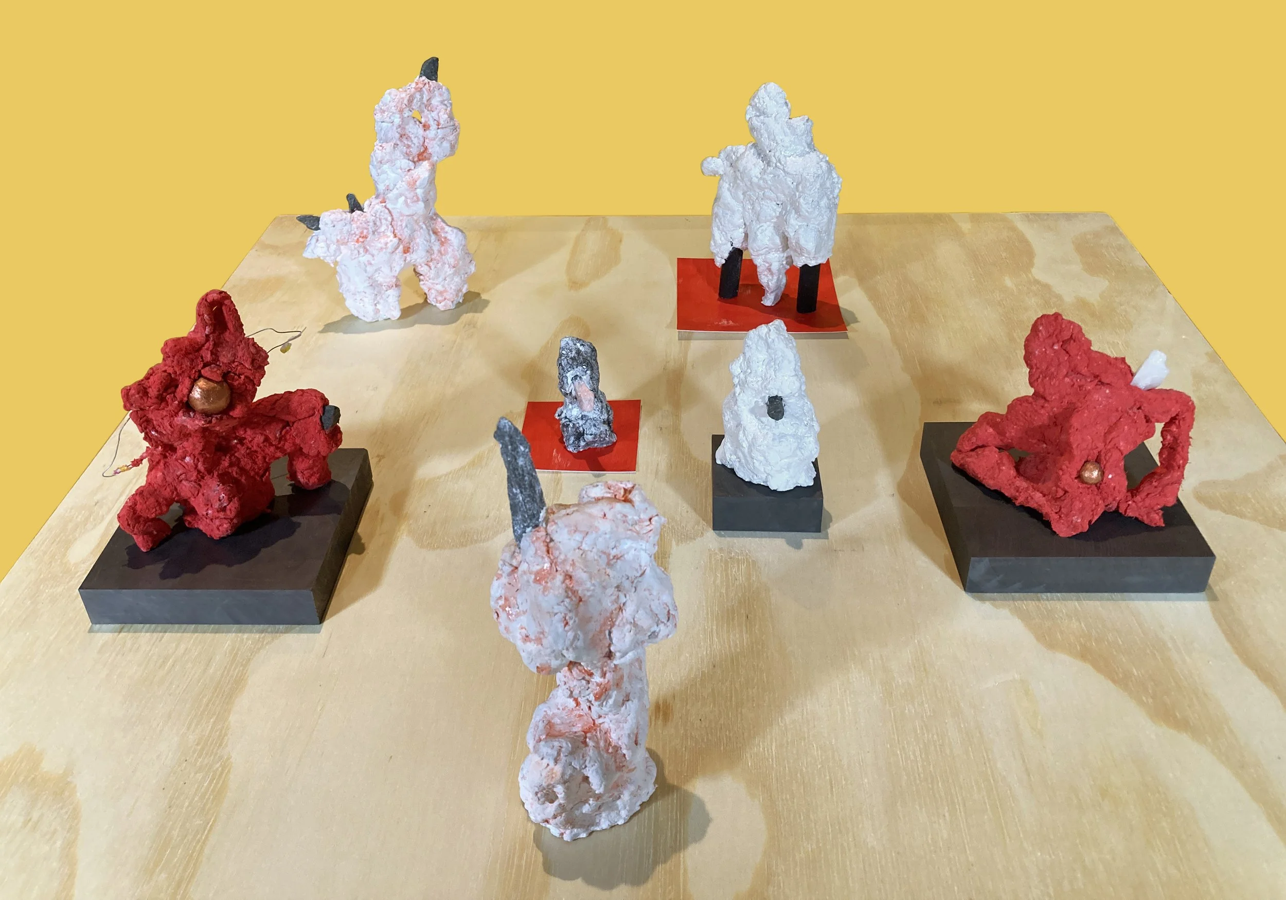 Georgina Lewis (she/her) works across media and is interested in forms of interchange and the aberrations and novelties, intentional or not, introduced by the act of “correspondence”: what happens when things come in contact and how they impact each other. She has worked with paper for several years and began lockdown with a box of paper pulp, tube of red paint, paper and pencils, materials she has continued to work with since. Her lengthy manual process results in multi-stage textural surfaces for her drawings and objects, which she enhances with graphite, rhinestones, and other materials at hand. Part of Lewis’s process is to push to the point of failure and work through it, often breaking her objects to reconfigure and rework them, adding additional surface details at the final stage. .